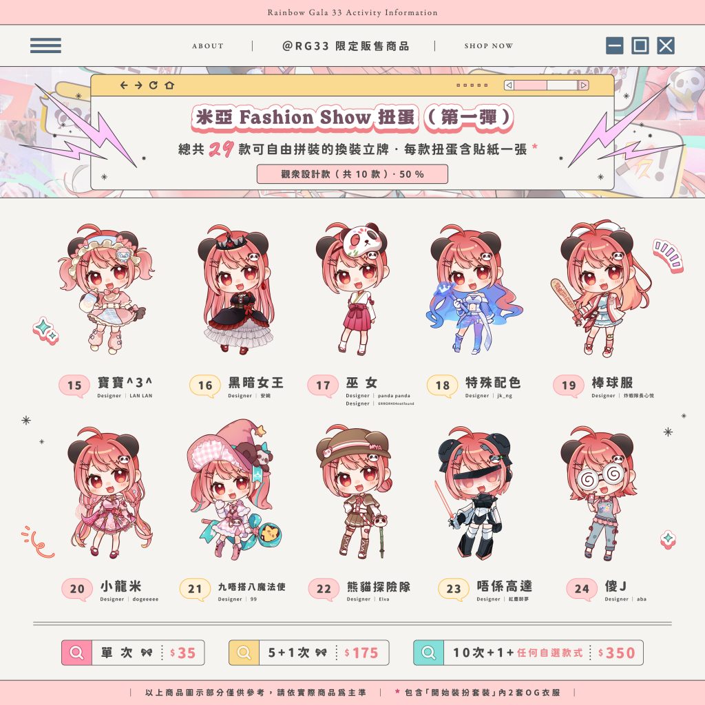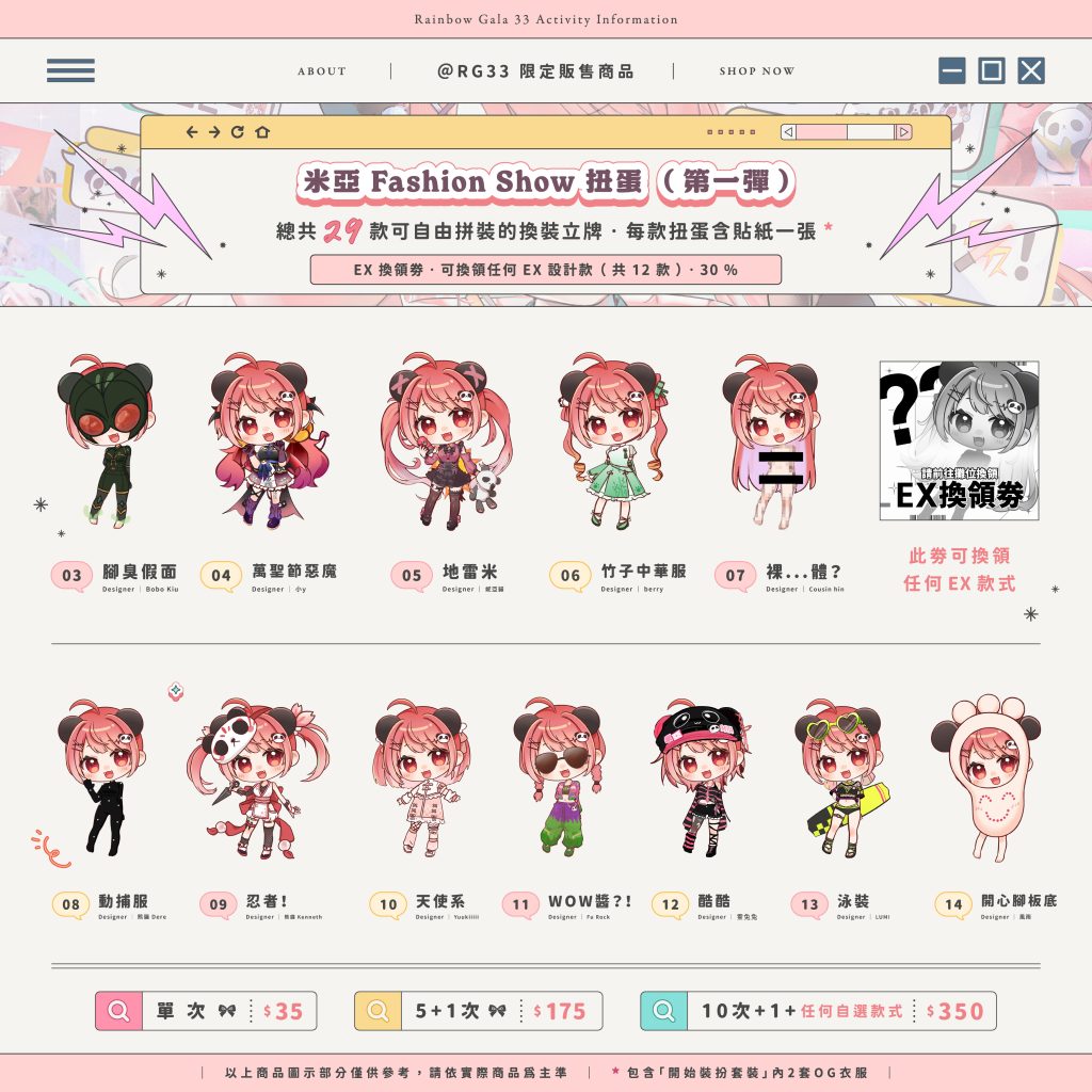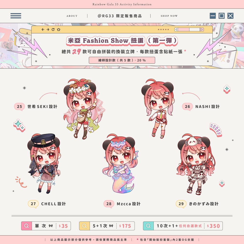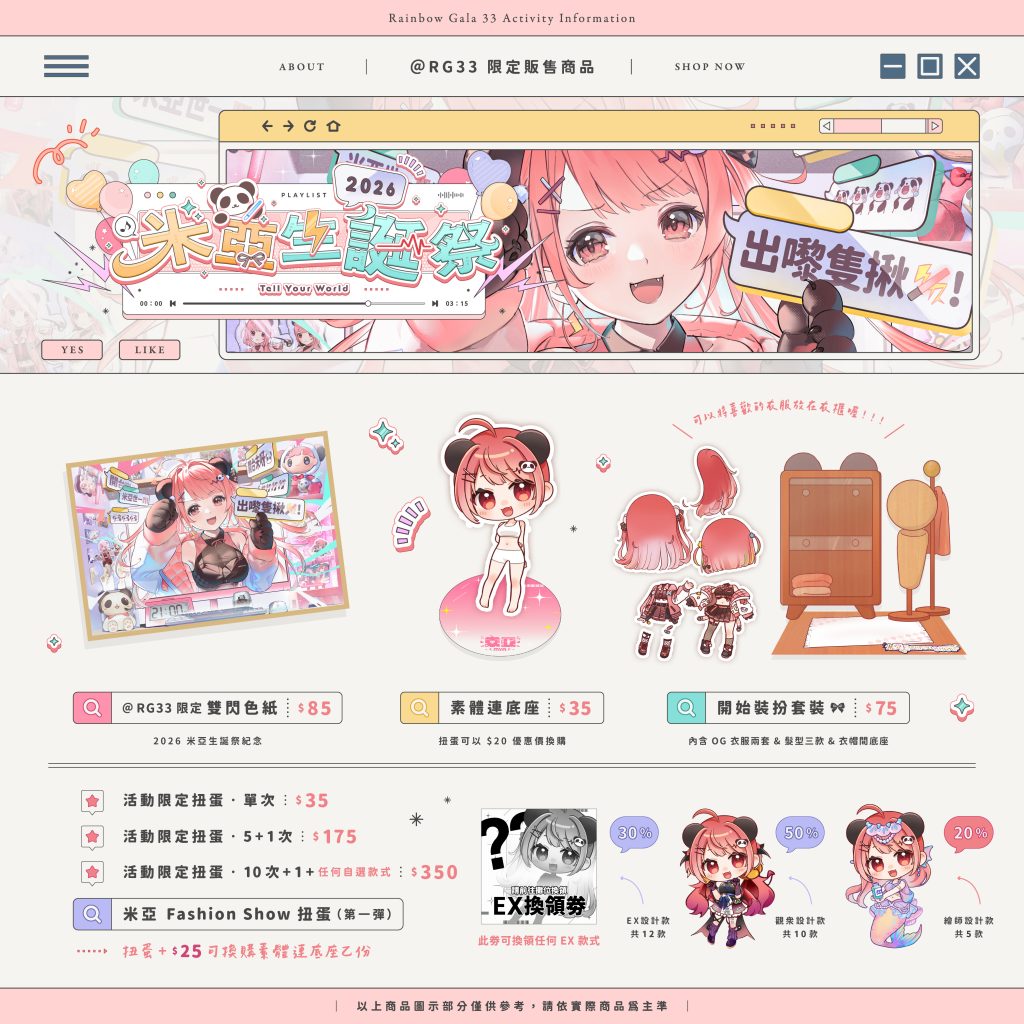 | 「米亞生誕祭2026」限定周邊 由於現場反應熱烈,本次開放網上購買RG33的限定周邊! ♪ 所有周邊皆限定商品,這次網購為最後機會,不要錯過啦 🎀 商品預購時間為即日起 至 1月11日,所以記得把握機會入手收藏囉 *重要* 扭蛋訂購須知
